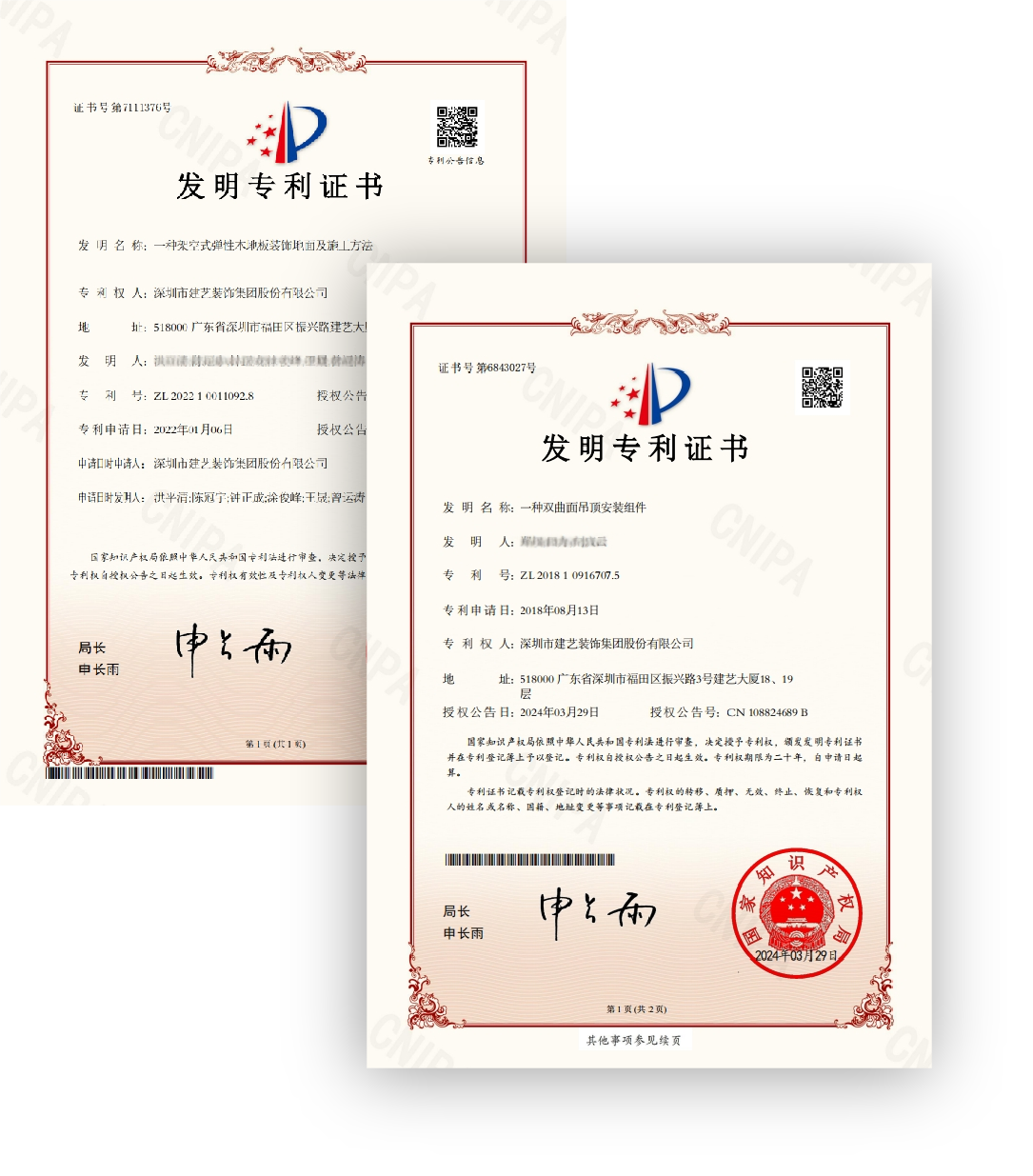 近日,建藝集團創新研發的“一種雙曲面吊頂安裝組件” “一種架空式彈性木地板裝飾地面及施工方法” “一種便于安裝的裝飾天花板”“一種具有吸音功能的室內墻板” “一種新型玻璃幕墻安裝結構”等7項發明專利和實用新型專利再次獲得國家知識產權局授權。