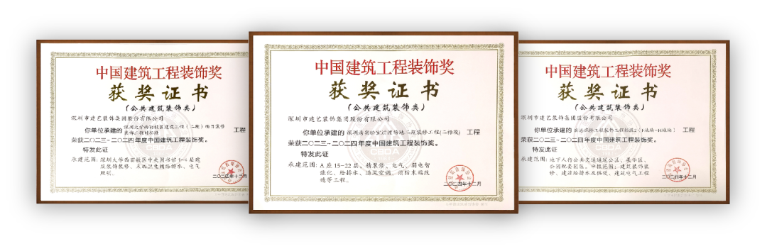 本次由建藝集團承建的“濱海廊橋工程裝飾工程標段2(F地塊-H地塊)項目、深圳大學西麗校區建設工程(二期) 項目裝修裝飾工程 VI 標段、深圳灣實驗室過渡場地二期裝修工程(二標段)三個項目榮獲2023~2024年度中國建筑工程裝飾獎”。