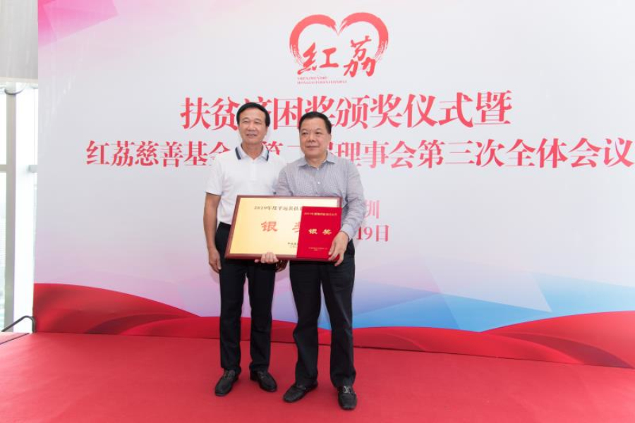 2019年度平遠(yuǎn)縣扶貧濟(jì)困獎(jiǎng)(銀獎(jiǎng))在星光熠熠的頒獎(jiǎng)儀式結(jié)束后,作為深圳市紅荔慈善基金會(huì)常務(wù)副理事長(zhǎng),劉海云又出席紅荔慈善基金會(huì)第二屆理事會(huì)第三次全體會(huì)議。期間,在扶貧濟(jì)困獎(jiǎng)?lì)C獎(jiǎng)儀式上,劉海云獲頒“2019年度平遠(yuǎn)縣扶貧濟(jì)困獎(jiǎng)(銀獎(jiǎng))”。