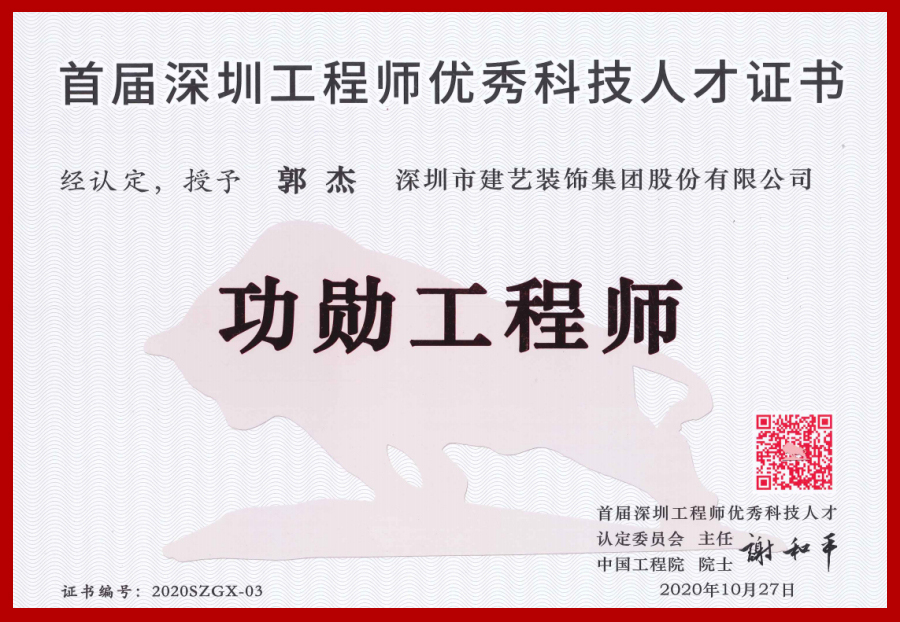 建藝集團設計研究院郭杰院長從事建筑裝飾設計數十載,擅長以獨到個性的美學思維與對建筑美學的深刻定義,將藝術與生活、光影與空間、設計與建筑、環保與未來充分融合,打造具有國際視野與可持續形態的裝飾設計典范,并強調設計的藝術性與可持續性。作為正高級工程師,能夠在首屆深圳工程師優秀科技人才評定中獲得“功勛工程師”殊榮,充分彰顯了郭杰院長在中國建筑裝飾工程、設計領域的卓絕實力,其對中國建筑裝飾設計行業的發展與進步起到了突出的推動與促進作用,是當之無愧的“設計大師”!