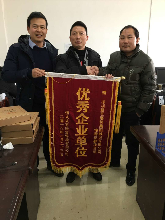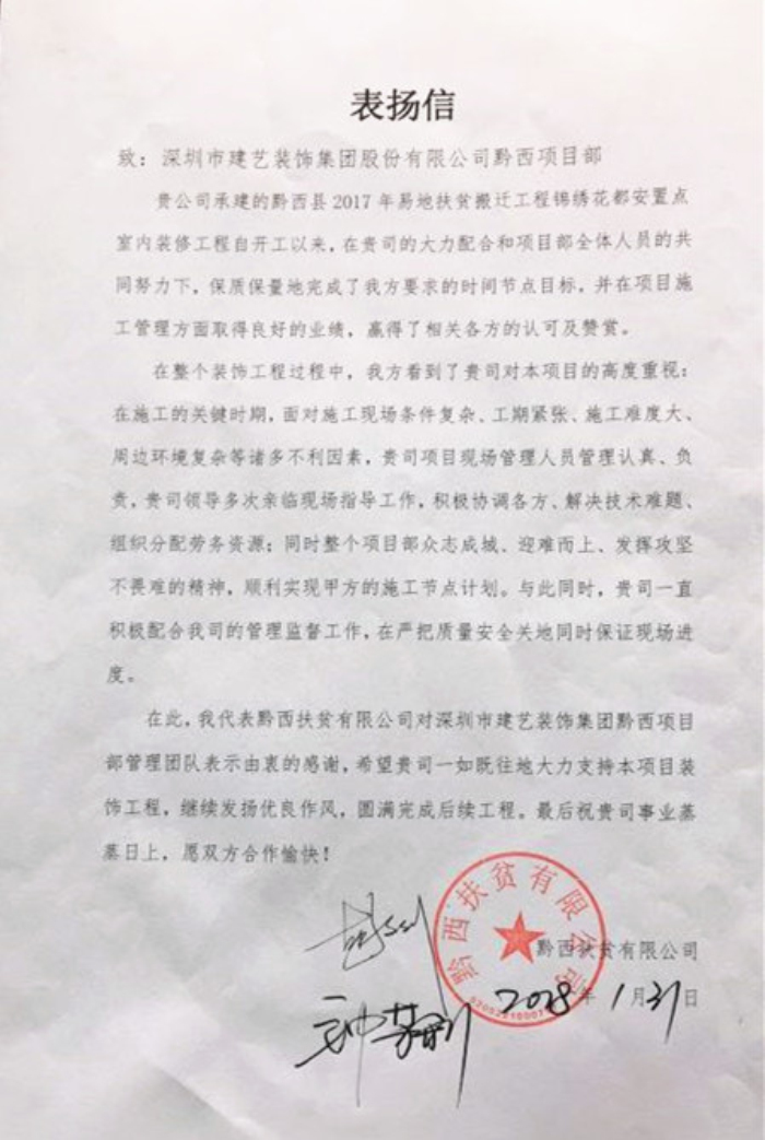 近日,黔西扶貧有限公司特向我司頒發“優秀企業單位”錦旗及表揚信以致感謝,并對建藝集團項目部全體人員提出表揚!