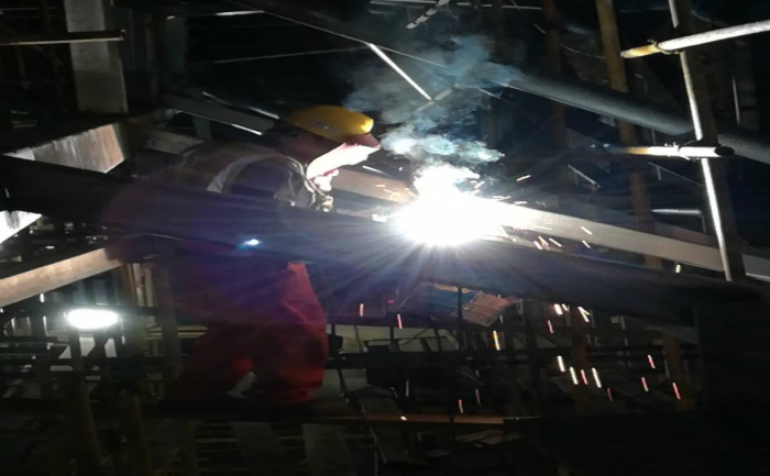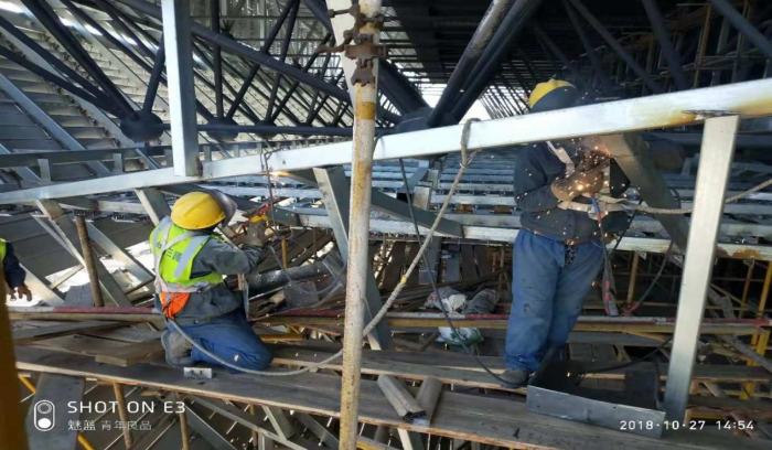 在施工過(guò)程中,有關(guān)該工程技術(shù)上的創(chuàng)新層面,樊華向我們介紹道:“山西太原濱河體育中心改擴(kuò)建工程施工過(guò)程中,由于建筑物的屋頂主體是大跨度的網(wǎng)架結(jié)構(gòu),存在外力荷載作用,網(wǎng)架變形的實(shí)際情況。項(xiàng)目經(jīng)理鐘正成在深化設(shè)計(jì)中,采用了雙向鉸接機(jī)構(gòu),既可傳遞幕墻水平荷載,又可適應(yīng)屋面的位移,在幕墻與屋面隔墻間采用風(fēng)琴橡膠板連接,一方面可保證幕墻的密封性能,另一方面可保證幕墻面板不被屋面較大的變形所破壞。鋼架底部的柱腳也在深化設(shè)計(jì)中既考慮了水平荷載和豎向荷載的安全功能性,又兼顧了室內(nèi)外的美觀性,采用了鉸接連接與焊接相結(jié)合的工藝,此項(xiàng)設(shè)計(jì)得到了建設(shè)單位及設(shè)計(jì)院的一致認(rèn)可并給予高度贊揚(yáng)。”