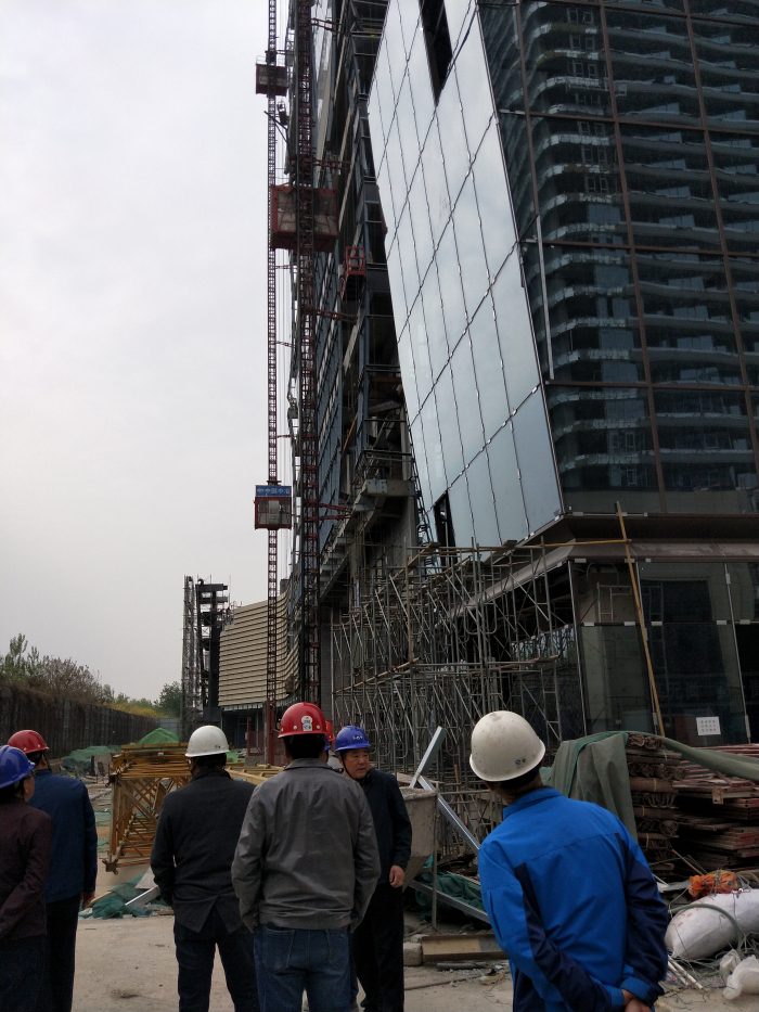 考察團(tuán)一行領(lǐng)導(dǎo)查看我司施工的斜面玻璃幕墻效果