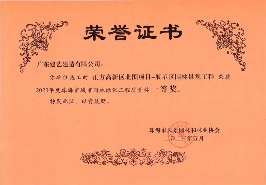 近日,由珠海市風景園林和林業協會主辦的珠海市城市園林綠化工程質量獎評選活動落下帷幕,深圳市建藝裝飾集團股份有限公司旗下廣東建藝建造有限公司承建的正方高新區北圍項目-展示區園林景觀工程榮獲“2023年度珠海市城市園林綠化工程質量獎”一等獎。