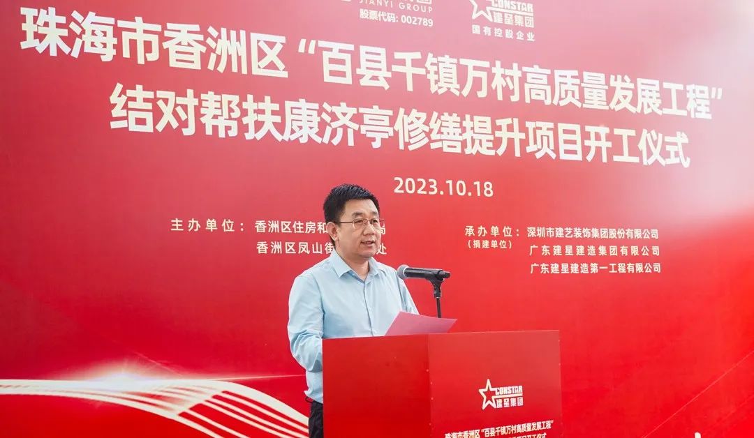 珠海市香洲區鳳山街道黨工委副書記、辦事處主任成平川發表致辭。他表示,自“百千萬工程”實施以來,鳳山街道加大城鄉區域統籌力度,促進發展空間集約利用、公共資源均衡配置、基本公共服務均等覆蓋,致力于補齊發展短板。鳳山街道注重廣泛調動社會力量,并得到了相關上級領導、部門和有關單位的大力支持。感謝建藝集團與建星集團對本次提升工程的結對幫扶,勇擔社會責任,發揮自身資源優勢,成為推進“百千萬工程”的強大助力。