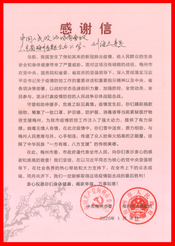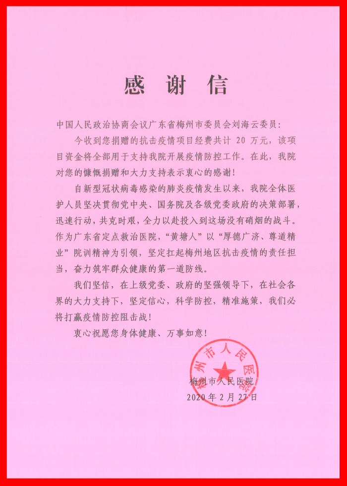 日前,梅州市委、市政府及梅州市人民醫(yī)院分別向建藝集團(tuán)發(fā)來感謝信,感謝梅州市政協(xié)常委、建藝集團(tuán)董事會(huì)主席劉海云率企業(yè)在疫情防控關(guān)鍵期,通過捐贈(zèng)口罩、善款等一系列大愛善舉,積極為梅州地區(qū)疫情防控提供幫助,并對梅州市疫情防控工作注入了強(qiáng)大動(dòng)力。