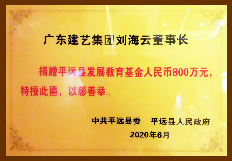 從1994年成立至今,作為廣東企業(yè)500強(qiáng)的建藝集團(tuán),始終把“以德為先,誠信為本,構(gòu)筑精品為目標(biāo)”的企業(yè)宗旨體現(xiàn)在促進(jìn)國家、民族與社會(huì)的繁榮進(jìn)步之中。董事會(huì)主席劉海云更是以身作則,堅(jiān)持用大愛回饋社會(huì),累計(jì)捐資數(shù)千萬元,為大批貧困地區(qū)提供支持,極大促進(jìn)了當(dāng)?shù)亟逃⑨t(yī)療、民生等事業(yè)的進(jìn)步發(fā)展。