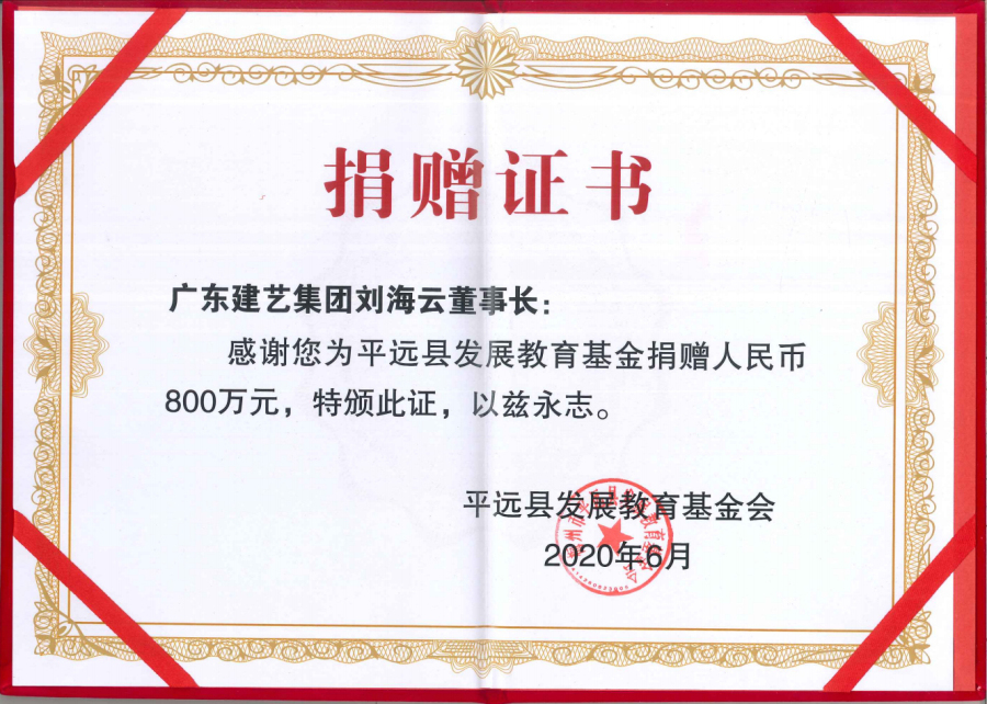廣博大愛·助力粵東從1994年成立至今,作為廣東企業(yè)500強(qiáng)的建藝集團(tuán),始終把“以德為先,誠信為本,構(gòu)筑精品為目標(biāo)”的企業(yè)宗旨體現(xiàn)在促進(jìn)國家、民族與社會(huì)的繁榮進(jìn)步之中。董事會(huì)主席劉海云更是以身作則,堅(jiān)持用大愛回饋社會(huì),累計(jì)捐資數(shù)千萬元,為大批貧困地區(qū)提供支持,極大促進(jìn)了當(dāng)?shù)亟逃⑨t(yī)療、民生等事業(yè)的進(jìn)步發(fā)展。