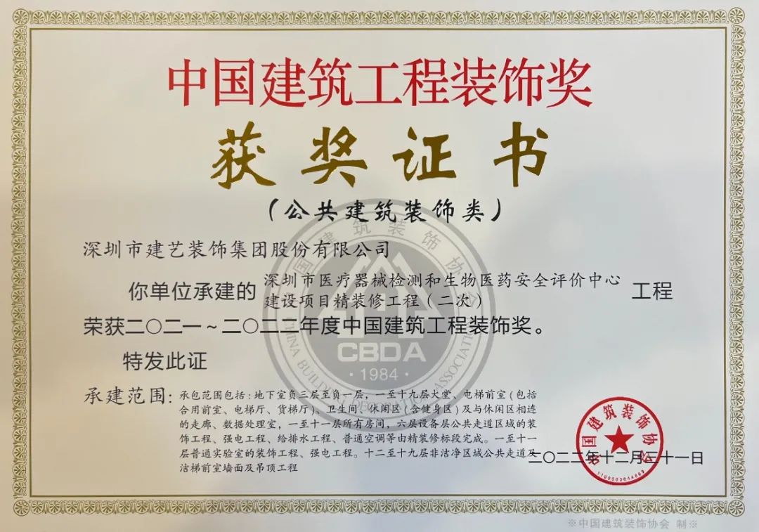 3月23日,由建藝集團參建的深圳技術大學(一期)建筑裝修裝飾工程Ⅵ標段(簡稱深圳技術大學項目)和深圳市醫療器械檢測和生物醫藥安全評價中心項目(簡稱深圳藥檢大廈項目)再獲殊榮,榮獲由中國建筑裝飾協會評選頒發的全國建筑裝飾行業最高榮譽獎項——“中國建筑工程裝飾獎”。