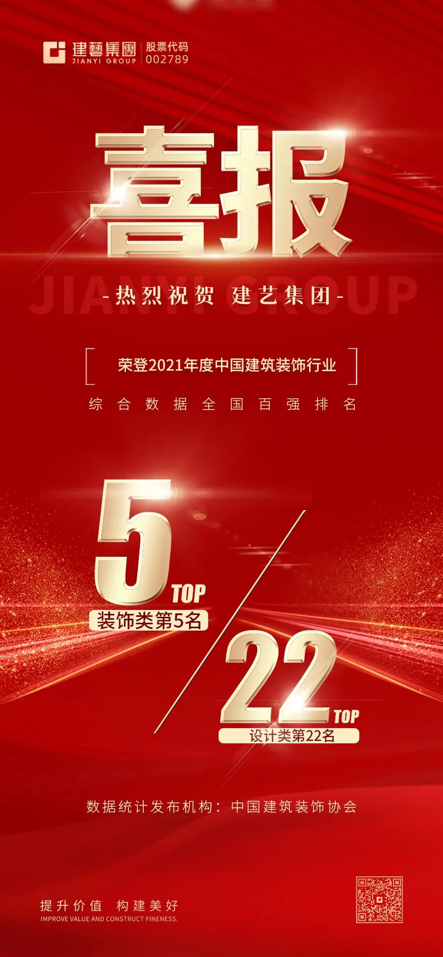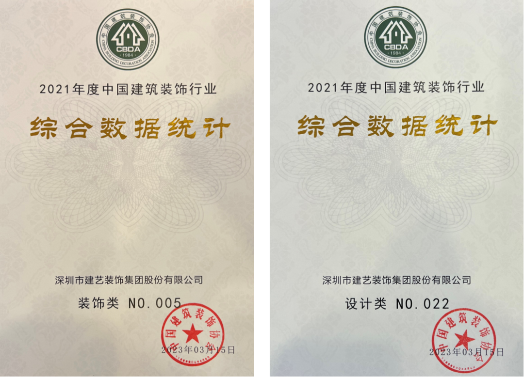 【重磅】建藝集團連續榮登中國建筑裝飾行業綜合百強榜排名裝飾類第5名和設計類第22名