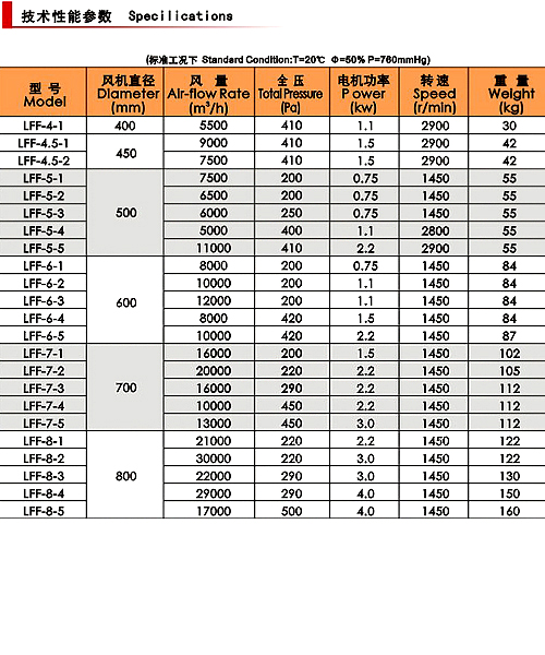 本系列風(fēng)機(jī)葉輪直徑由小到大共分為4、4.5、5、6、7、8等六種機(jī)號,風(fēng)量5500~30000m3/h,風(fēng)壓200~500Pa(詳見參數(shù)表)。