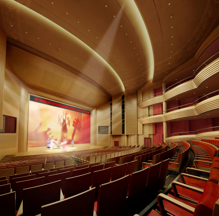 其觀眾廳天花設(shè)計為貫通的兩道面光的傳統(tǒng)模式,不但滿足了面光數(shù)量和角度的要求,呈階梯狀的弧面天花造型對聲音的傳播起到很好的擴(kuò)散作用,讓直達(dá)聲更多的到達(dá)觀眾席。天花避免單調(diào)的平頂造型,設(shè)計簡單的凹縫處理,內(nèi)嵌造型紋樣,取自秦文化的玄鳥圖騰。耳光室兩側(cè)位置設(shè)計回形紋樣造型,也是作為獨(dú)特藝術(shù)可識性的體現(xiàn)。把使用功能放在第一位,同時增加相關(guān)地域文化元素,讓整體達(dá)到經(jīng)濟(jì)實(shí)用目的,同時含蓄的體現(xiàn)了秦文化內(nèi)涵。
