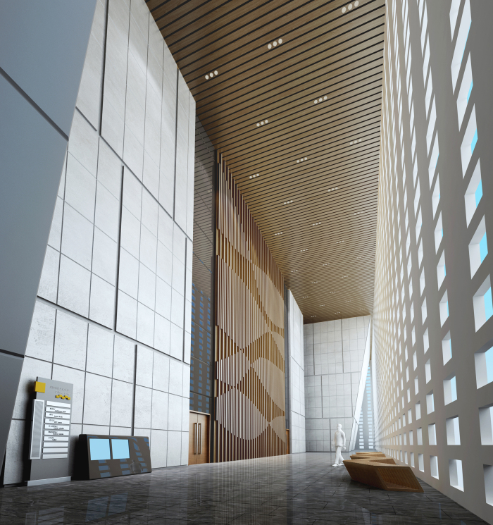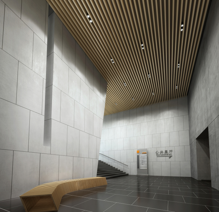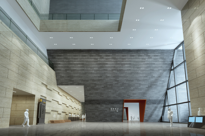 劇院入門大廳設(shè)計延續(xù)建筑設(shè)計手法,將建筑外觀元素進(jìn)行深化、細(xì)化及組合,形成豐富變化。將城墻磚的體塊感、灰紅對比等方式體現(xiàn)出歷史厚重感以及中華燦爛文化的親和力。墻面利用統(tǒng)一的米黃色洞石工字縫拼接,加強(qiáng)了空間的統(tǒng)一性與整體感。在材質(zhì)、造型、比例、色彩、照明等室內(nèi)設(shè)計多種元素上,注重相互關(guān)系與空間協(xié)調(diào)感。