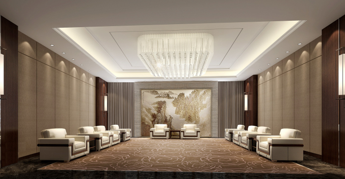 VIP接待室布局大氣,設(shè)施完善。主背景墻掛畫選擇秦文化相關(guān)藝術(shù)畫作,一圈的回字紋延續(xù)其他空間設(shè)計元素。整體表現(xiàn)高貴而雅致,充分滿足接待休息使用要求。
