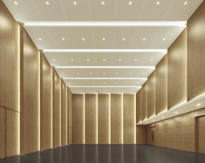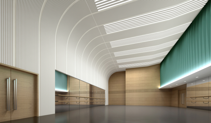 排練廳設(shè)計中,材料的統(tǒng)一強(qiáng)調(diào)空間的縱深感,墻面硬包的處理增加吸聲面積。天花與墻面融為一體,流動的線條與節(jié)奏韻律感相呼應(yīng)。